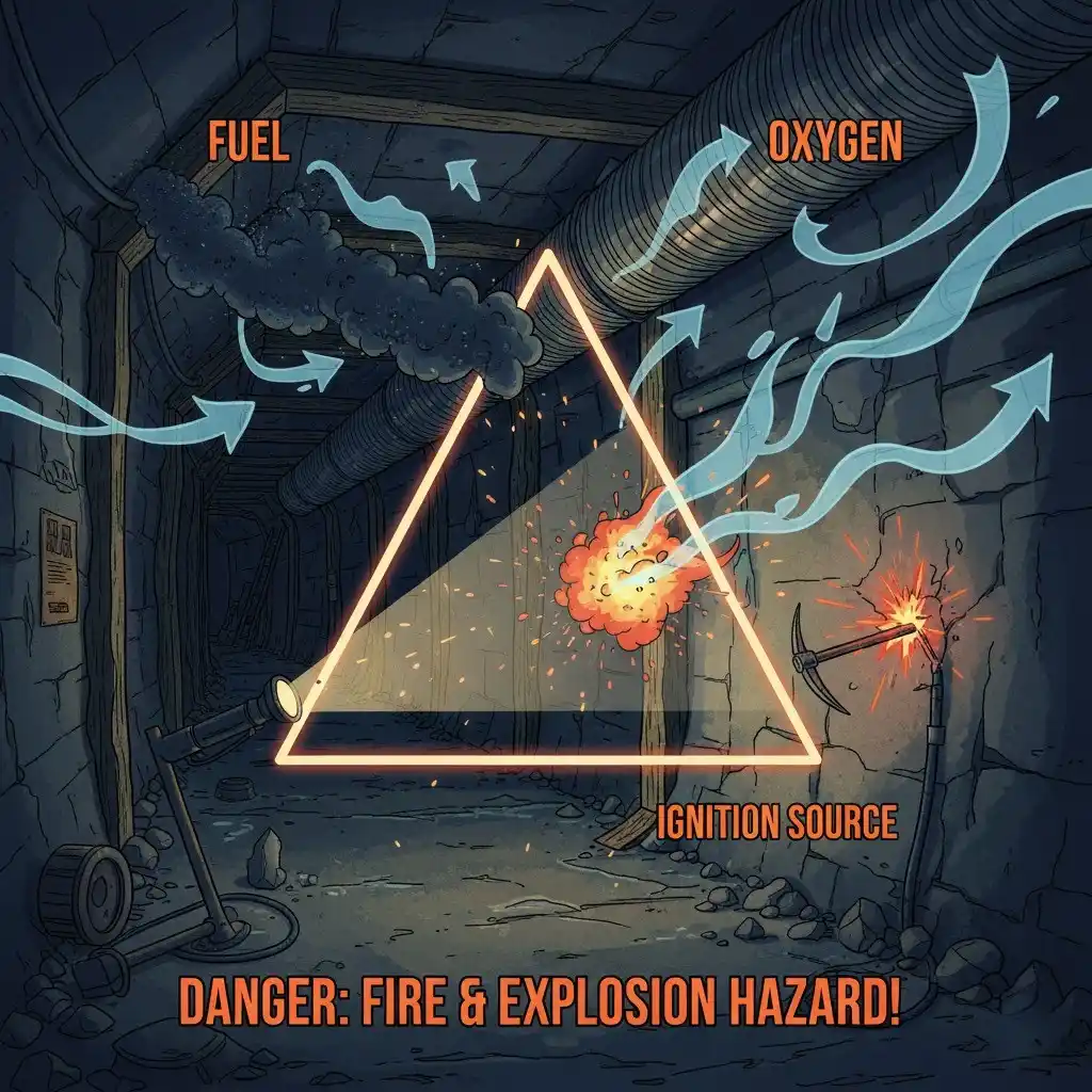 - Gas Inflamable (Metano): El metano es un subproducto natural de los mantos de carbón. Si se acumula en un espacio confinado, puede formar una mezcla explosiva con el aire.