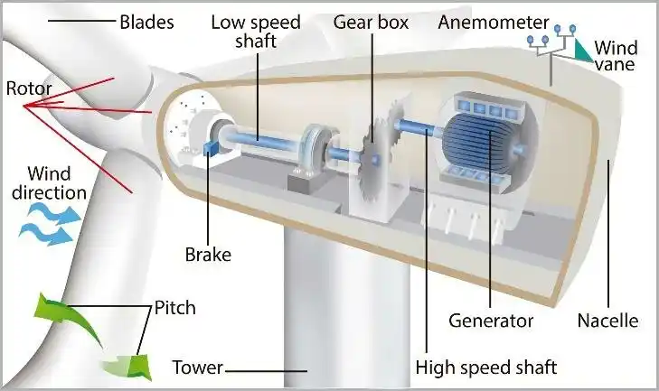 - During Operation: The system makes micro-adjustments to the blade pitch to maintain a constant rotor speed and power output once the wind speed exceeds the turbine’s rated limit.